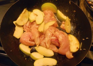 Add a tablespoon of butter to the pan with the chicken tenders and apples and cook for about five minutes until the tenders start to brown.